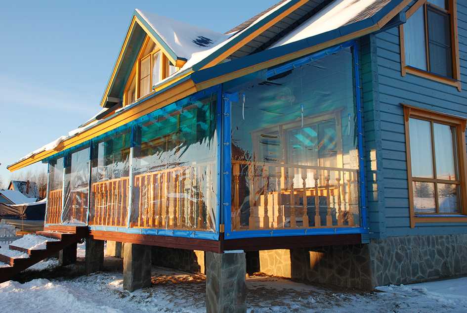 Такая завеса их ПВХ морозоустойчива, долговечна, ее оставляют на зиму. Внутри уютно в любую погоду, недостаток воздуха устраняют проветриванием. Такой вариант дизайна практичен, прост в уходе, он состоит в протирании влажной тканью