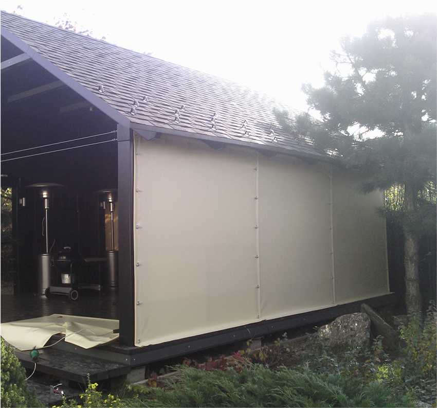 Такой вид занавеса практичен, защитные полотна выбирают из плотного материала – брезента, парусины, синтетических тканей с тефлоном, акрилом. Они устойчивы на солнце и незаменимы в непогоду.