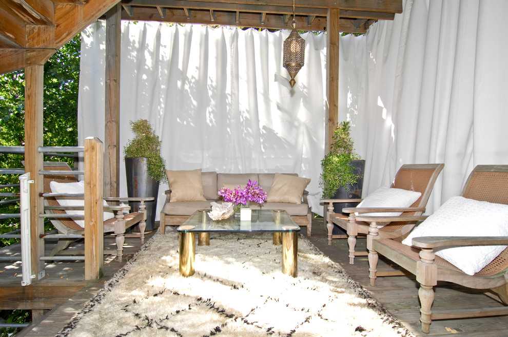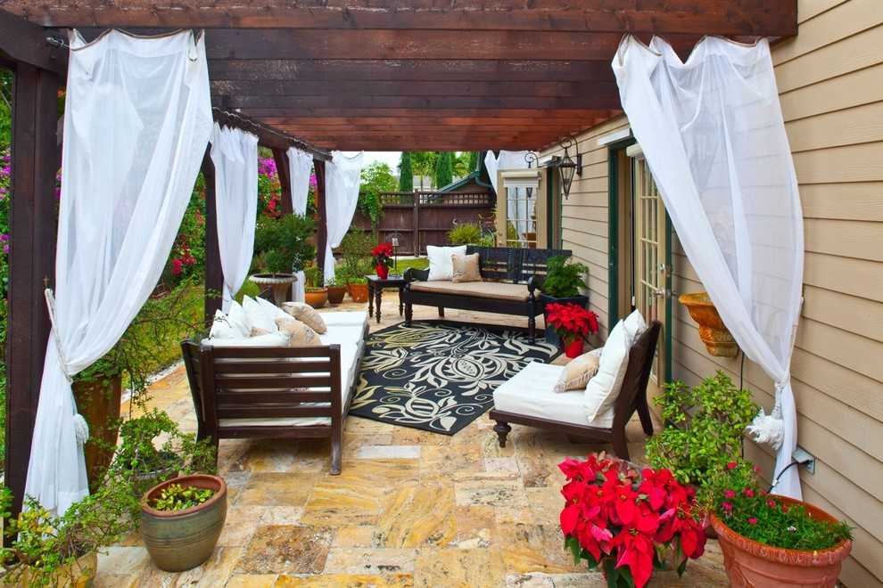 Невесомый легкий тюль в открытой беседке подойдет для теплого времени года