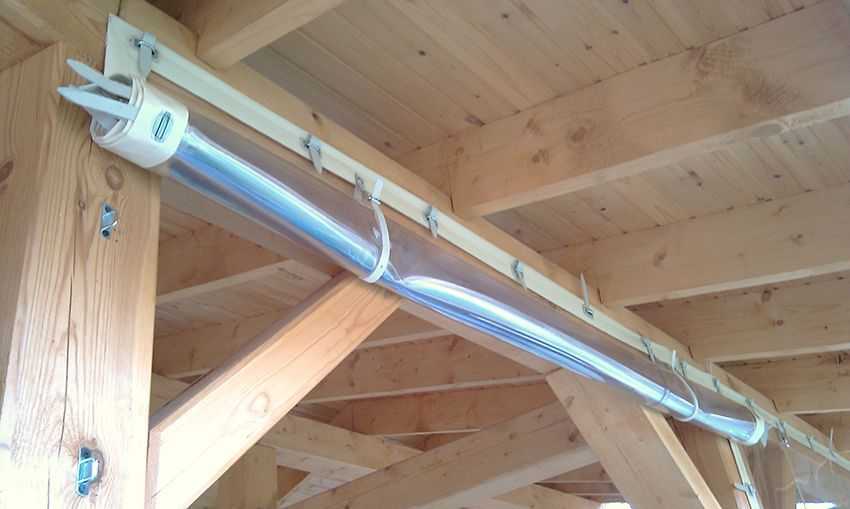 - Внутри веранды, террасы или беседки ПВХ-полотна закрепляют на штангу при помощи люверсов. Управление происходит традиционным способом — сдвиганием полотна в одну из сторон. Из-за неплотного соединения защита помещения будет не слишком эффективной, особенно от осадков и ветра.