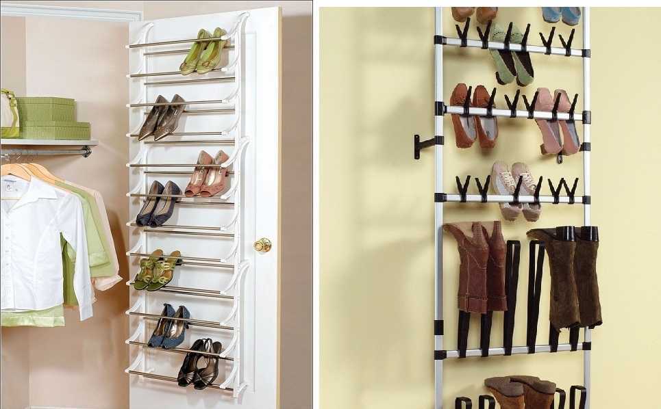 Есть обувница из проволоки, которую можно навесить на любую вертикальную поверхность. Это может быть та же стена, дверь шкафа, кладовки, гардеробной и т.п. Они замечательно заменяют органайзер для обуви. Стоят, конечно подороже, но пользоваться ими удобнее, обувь не так мнется и лучше держит форму. Пару таких вариантов можно увидеть на фото ниже.Пару навесных моделей