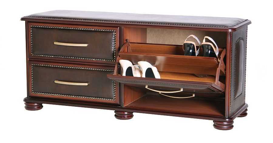 - стационарные – обычные изделия из мебельных щитов, на которых удобно располагать различные предметы, в т.ч. обувь;