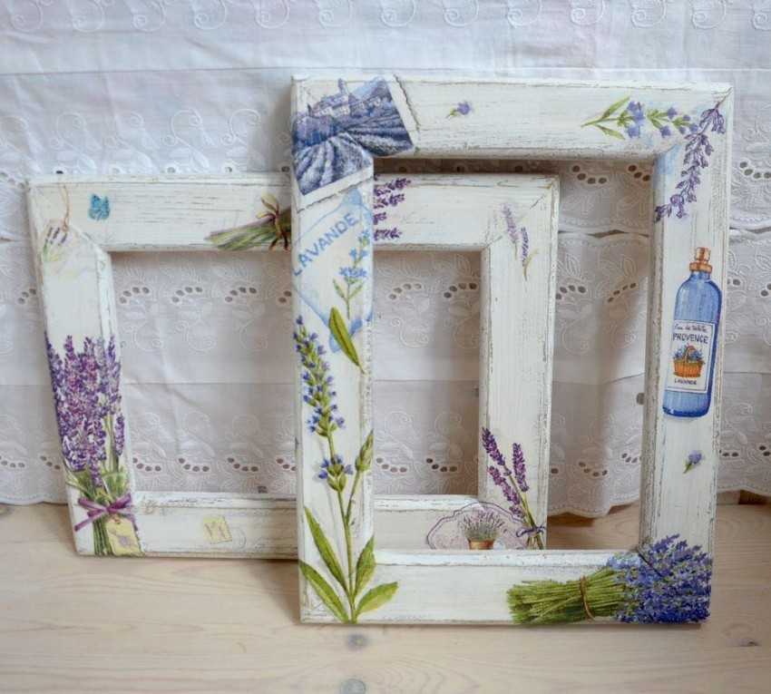 Прованс.Интерьеры, оформленные в духе прованса, могут украшаться декупажем с растительными мотивами (в особом почете традиционная флора Средиземноморья – лаванда, мелкие садовые розы, подсолнухи), натюрмортами (подойдет корзина с фруктами, морепродуктами или хлебом), животными (изображения кошек, кроликов и так далее), пейзажами и даже портретами (прекрасно подходят изображения детей).