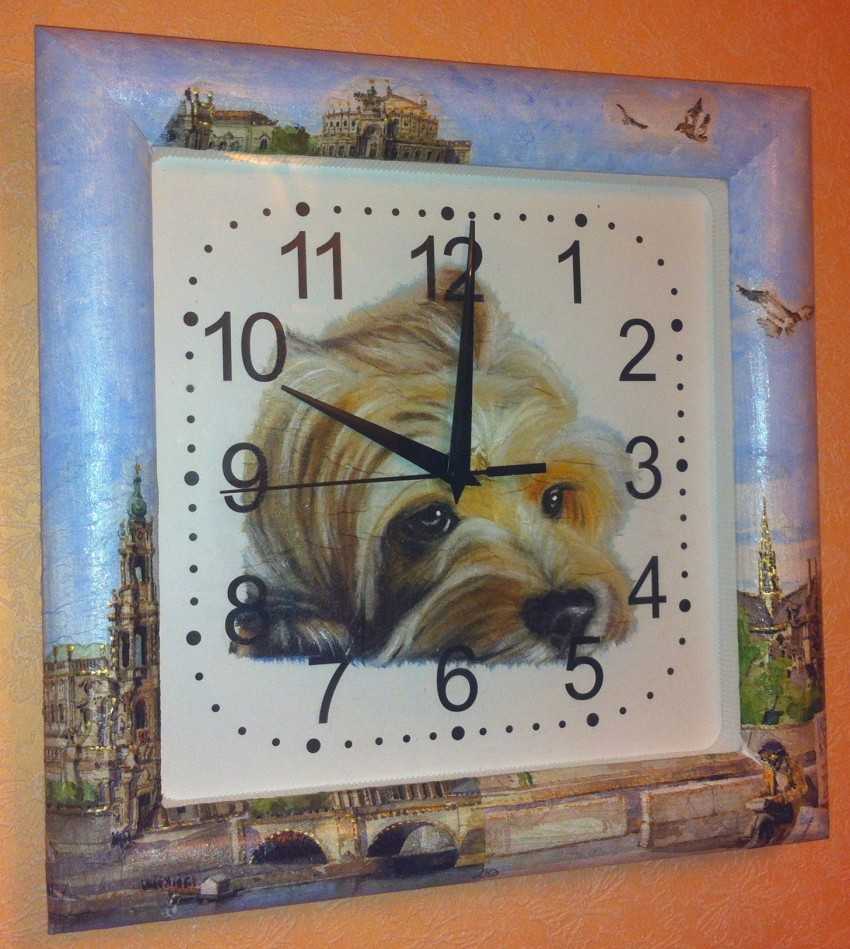 Часы можно декорировать, применяя специальные салфетки и бумагу для декупажа. Купить такие материалы можно в специализированных магазинах для творчества. На часах отлично будут смотреться семейные фотографии, фото природы или любимые картинки.