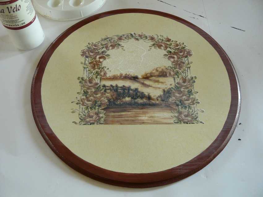 Наждачной бумагой средней зернистости зашкурить окрашенную поверхность. Остальные краски тоже наносим слоями, давая каждому из них высохнуть. Если сделать все правильно, поверхность не будет иметь слишком насыщенный цвет. Затем производится работа с картинкой в обычной технике декупажа.