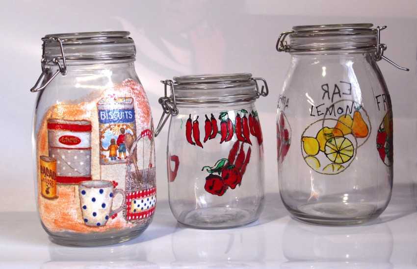 Очень гармонично смотрится декупаж на кухонной утвари. О разделочных досках и хлебницах мы уже упоминали. Особую пикантность вашей кухне придаст набор банок для специй ли сыпучих продуктов, украшенный аппликациями на кулинарную тематику.