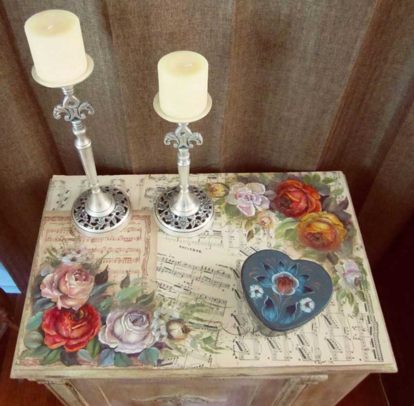 Технику декупажа можно использовать наряду с приемами реставрации предметов мебели и интерьерных украшений