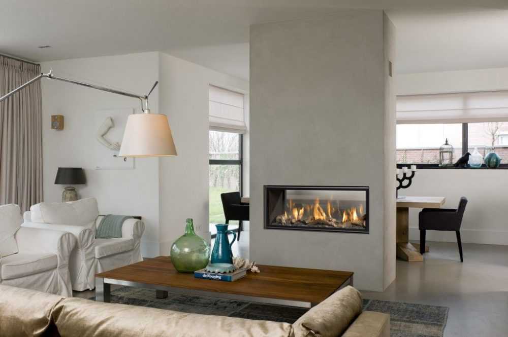 Камин, что внутри перегородки, облегчает конструкцию. Такое его размещение дает возможность наслаждаться живым огнем с двух сторон