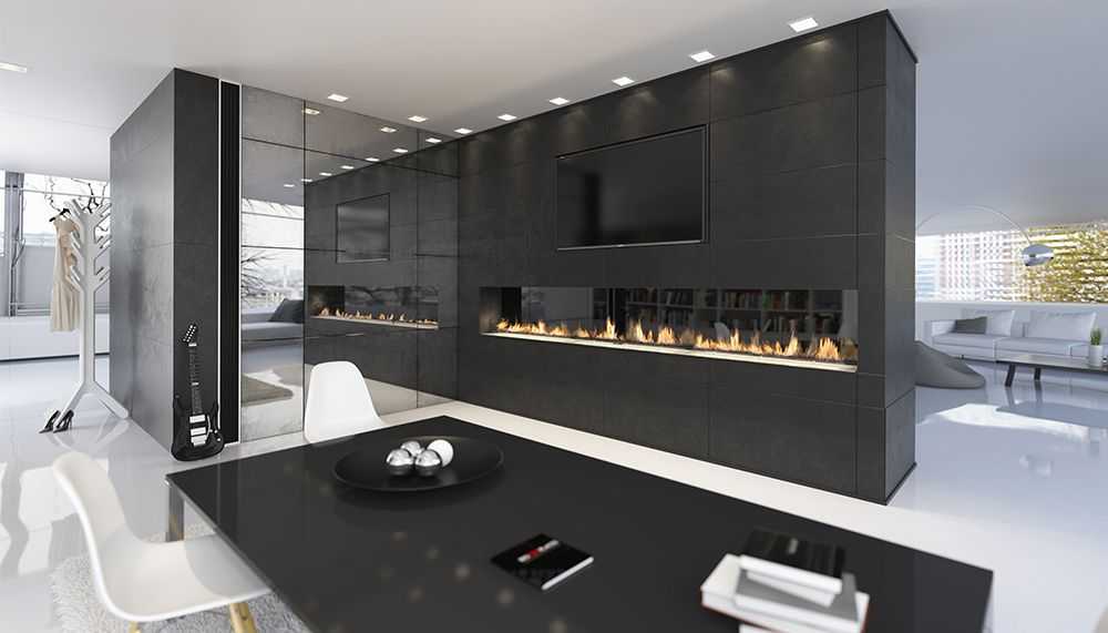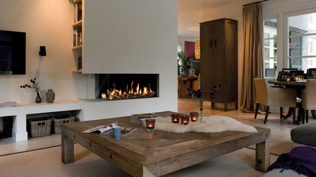 Модели сквозных биокаминов устанавливают в проемах стен, тем самым они обозначают границы между разными функциональными (жилыми) зонами. Если планировка квартиры позволит, можно встроить трехсторонний сквозной камин, эффектно разделяющий пространство на функциональные мини-территории.