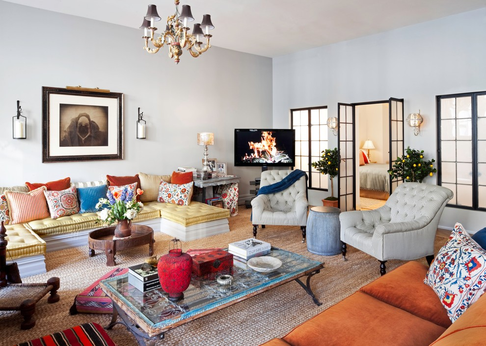 - низкий яркий диванчик с яркой обивкой и многочисленными подушками;