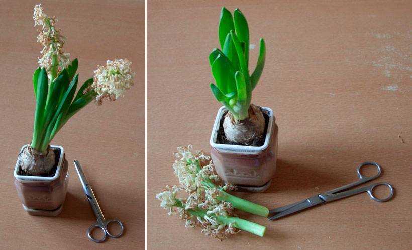После цветения начинается увядание гиацинта. Сначала отмирает цветонос, затем листья. Первый нужно удалить до появления завязи, в противном случае луковица потратит энергию на формирование семян, что в данный момент совсем не нужно. Обрезку проводят сразу после того, как цветок будет выкопан из земли. Процедура нужна для того, чтобы удалить лишние ткани. На них могут остаться различные вредители или паразиты, которые не позволят сохранить луковицу в период покоя. Стебель срезают полностью, оставляя только небольшой пенек.