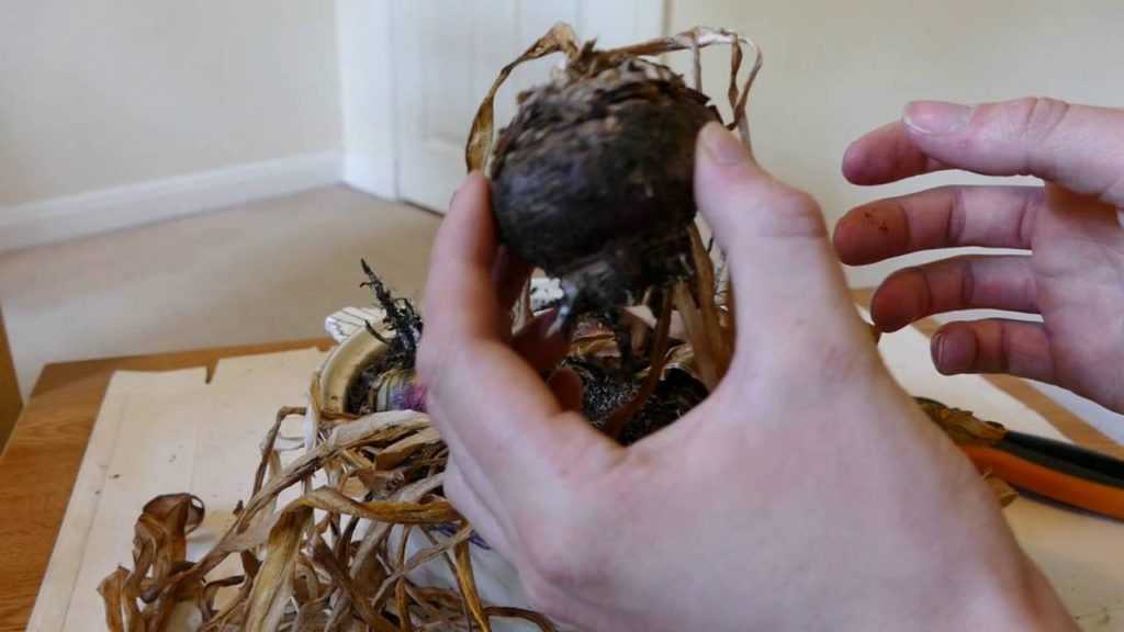 После того как околоцветники и стебли многолетника после обильного цветения засохли, их аккуратно удаляют острым лезвием или ножом. Луковицы ещё в течение нескольких месяцев поливают и удобряют до тех пор, пока не завянет листва. За это время клубни успеют восстановить силы для закладки новых цветоносов, становятся больше по размерам и образуют луковицы-детки.