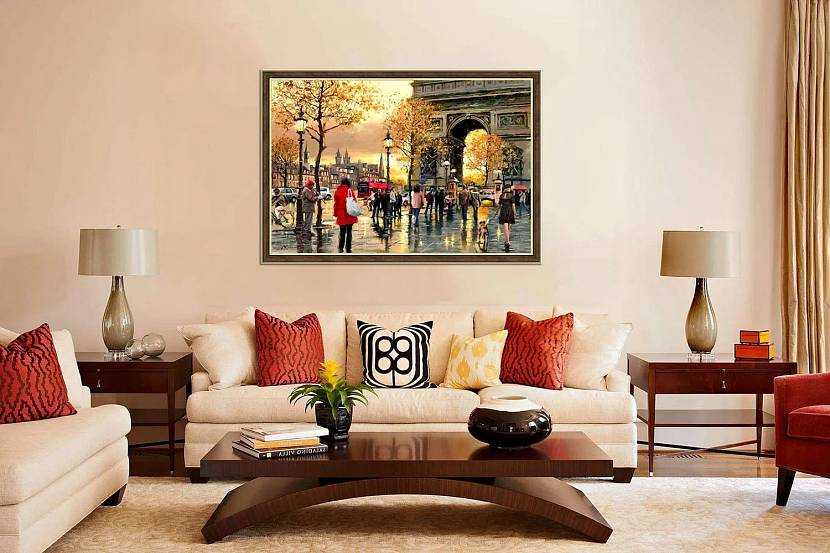 Одна большая тематическая картина. Ей необходимо большое пространство, и лучшим выбором станет стена за диваном. Классические полотна заключают в тяжелую резную раму; современные могут обойтись без обрамления. Если полотно большое, его центр будет находиться выше уровня глаз, поэтому оно подходит для украшения просторных комнат.
