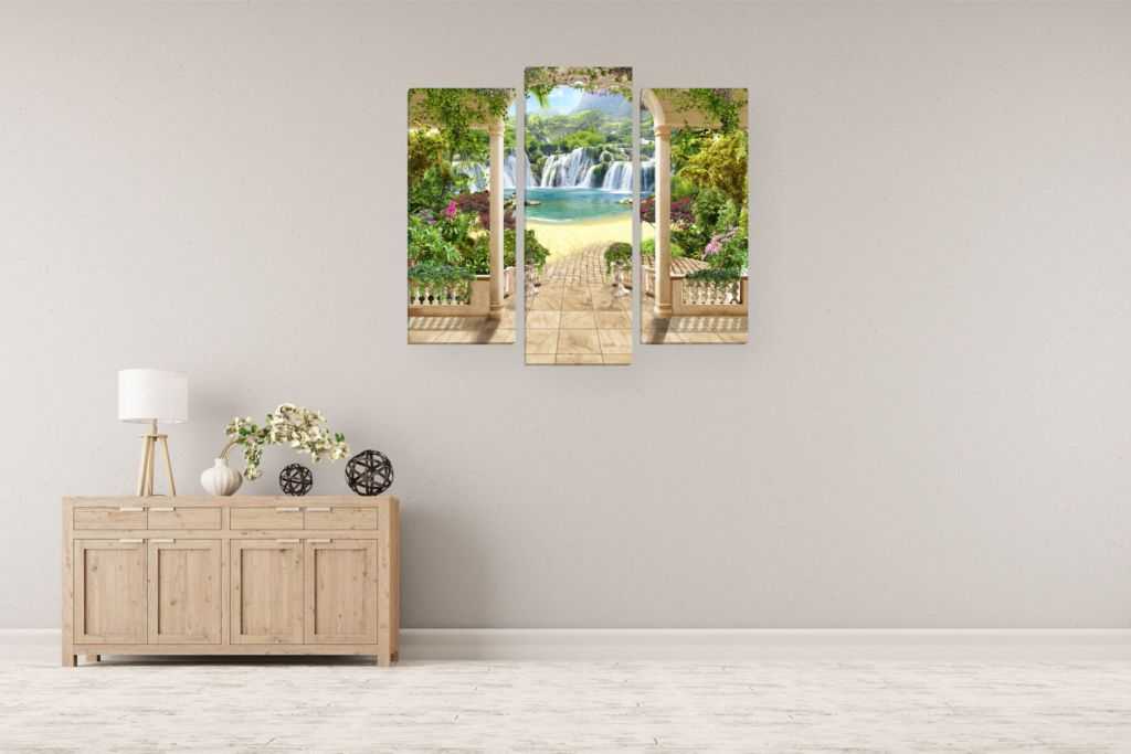 соблюдение строгой симметричности. Примером может служить комбинация из двух вертикальных полотен по центру и прямоугольными изображениями с двух сторон. Полотна равных размеров хорошо размещать в несколько рядов