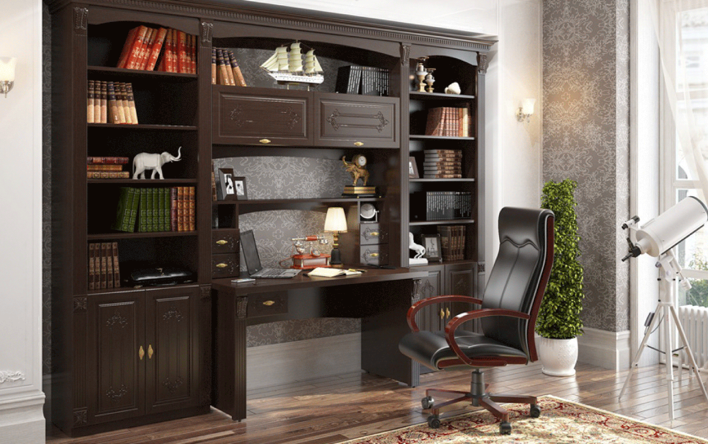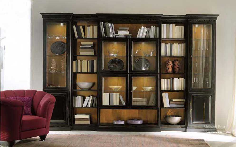 в классическом стиле книжные шкафы – это элегантность форм, благородная расцветка и мягкость линий. Они изготавливаются из ценных пород дерева, обильно украшаются резьбой, патинированием, литыми бронзовыми элементами, накладками