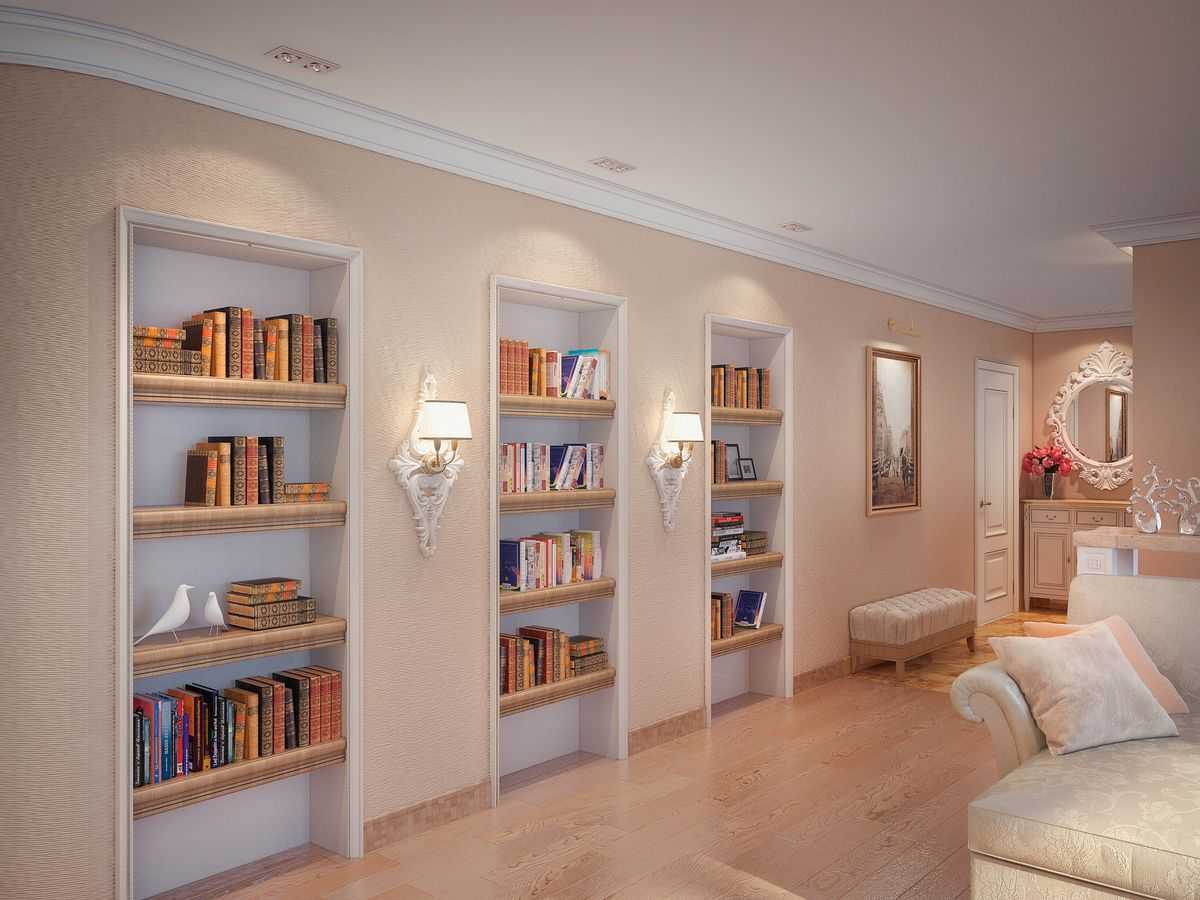 - встроенные в нишу – подходят чтобы разместить небольшую коллекцию книг. Эргономичный вариант, вместит все книги и не займёт много площади. Книжные шкафы, встроенные в нишу, экономят пространство и позволят тактично обыграть сложный интерьер.
