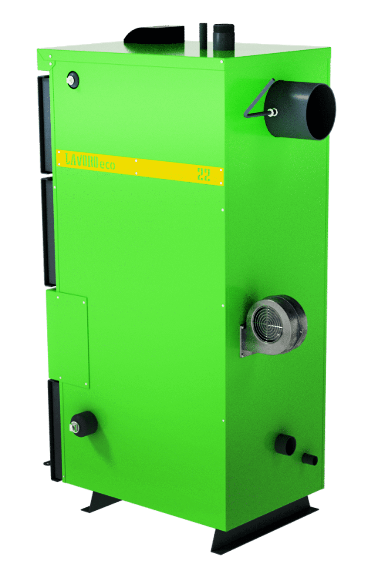 Надежный агрегат на твердом топливе, мощностью до 32 кВт. Способен прогреть площадь в 320 метрова квадратных. Возможно установить дополнительно ТЭН и подключить внешнее управление.