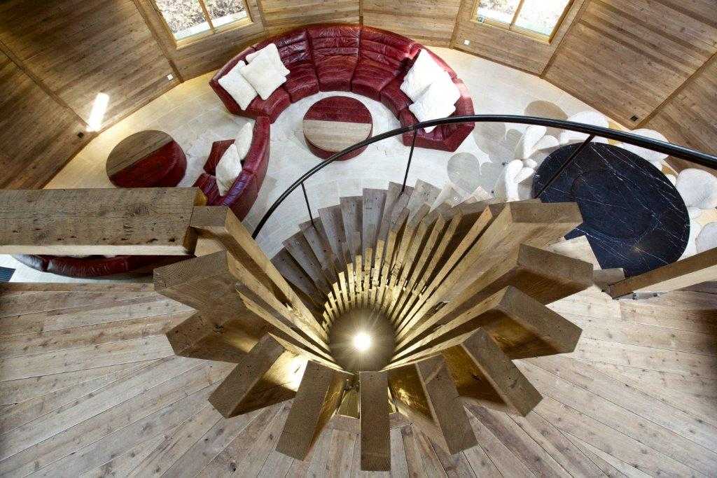 Проекты круглых домов выглядят необычно даже снаружи. А если подчеркнуть округлые стены еще и внутри, вид дома будет законченным и лаконичным. Однако по этому поводу у разных дизайнеров возникают противоположные идеи. Если план круглого дома дает такую возможность, то первой оформляется лестница на верхний этаж