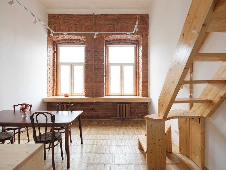 Чтобы попасть в квартиру Андрея, нужно зайти в коммуналку на четвертом этаже бывшего доходного дома, миновать общий коридор и постучать в массивную дверь. За ней находится студия с высоким (более четырех метров) потолком и вторым ярусом. Быт недавно отремонтированного помещения контрастирует с потертой коммунальной эстетикой общего пространства.