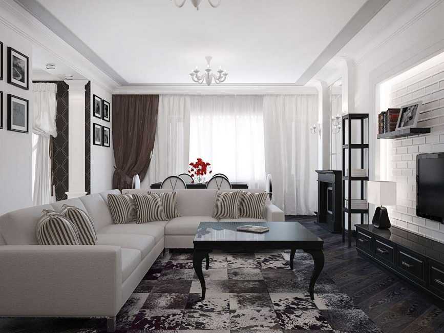 Монохромное цветовое исполнение считается очень оригинальным дизайнерским приемом. Для интерьера маленького зала будет уместно применение черно-белой гаммы с красочными элементами.
