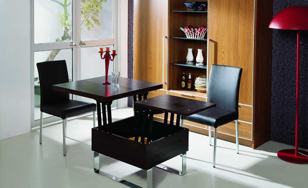 Чаще всего стандартный стол для приема пищи меняется на трансформирующуюся модель, которая основную часть дня спрятана либо выполняет другую функцию, например, тумбы для размещения горшков с цветами или посуды. Оригинальный вариант — закрепленный на стене откидной стол, в собранном виде он становится практически плоским. Часто используются модели, которые прячутся в нише под столешницей.