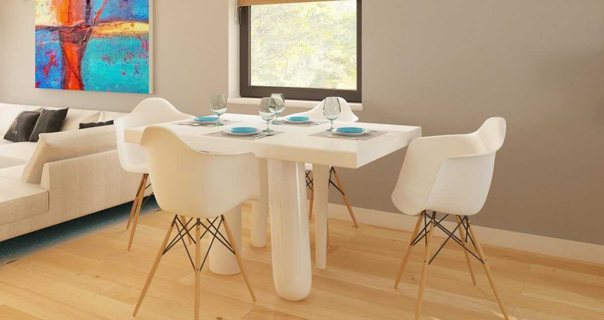 В гостиную можно поместить обеденный стол