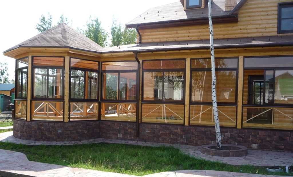 Раздвижное остекление веранды и террасы позволяет установить большие окна различной формы.