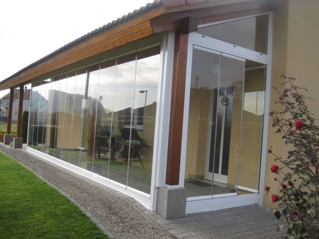 Очень популярным решением является остекление веранды при помощи раздвижных стеклянных панелей. Применяется алюминиевый профиль. Обходится несколько дороже других видов остекления, но отличается более высокой эффективностью. На выбор покупателя доступны модели, способные открываться дистанционно, за движение отвечает электропривод.