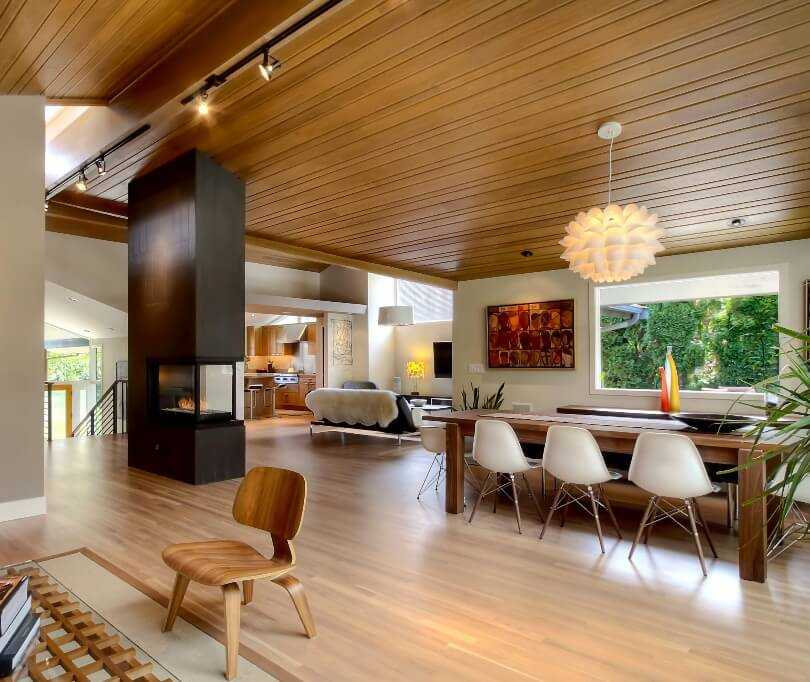 Для такого стиля характерно объединение помещений – гостиную с каминным залом, кухню со столовой.