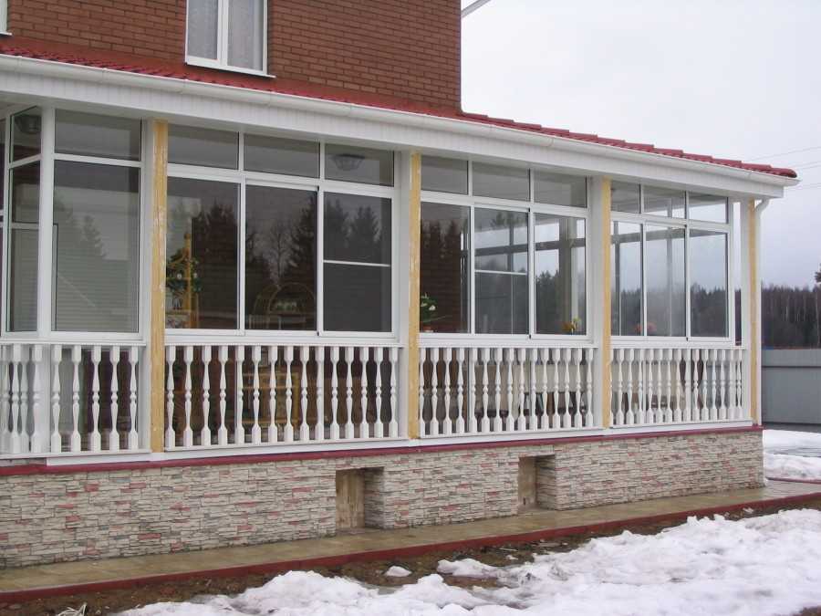 По-другому пристраивается веранда в частном доме, которая защищается от непогоды со всех сторон стенами высотой 80 – 100 см. Остекление делают одинарное, используют прозрачные листы толщиной 3 – 4 мм. Рамы делают из дерева, легкого металла, ставят металлопластиковые изделия.