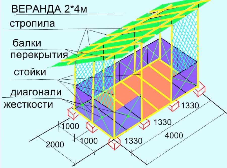 осуществляется в последнюю очередь, хотя именно с его закладки начинается строительство веранды. Причина подобного подхода заключается в необходимости знать полный вес пристройки, учитывая также снежную, ветровую и эксплуатационную нагрузку на неё. Тем не менее, часто под веранды устанавливаются столбчатые, свайные или ленточные фундаменты:
