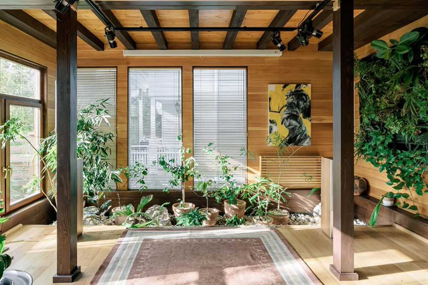 Оригинальное натуралистическое решение, предполагающее использование деревянных планок, растения будто «выглядывают» сквозь щели.