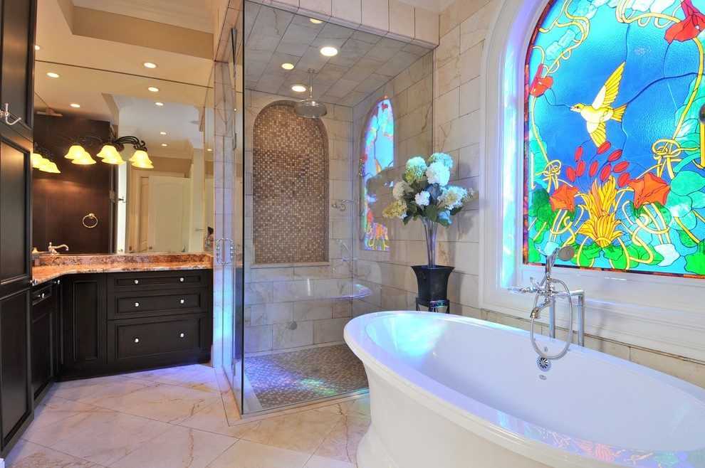 Витражная пленка с рисунком выделяется своей водонепроницаемостью, из-за чего ее часто применяют на перегородке в ванной комнате, а также матовую белую витражную пленку используют на дверях душевых кабин.