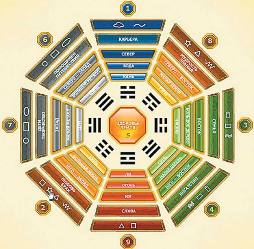 Согласно древнейшему учению фен-шуй все, что случается в жизни каждого человека можно поделить на девять основных сфер. Всех их отражает восьмиугольник или сетка Багуа. Фен-шуй именно ее использует как главный инструмент для оценки и анализа энергии любого помещения. Данный восьмиугольник – это энергетическая карта, поделенная на девять секторов, каждый из которых соответствует одному из основных аспектов жизни и определенной зоне в помещении. От того, насколько правильно такие зоны обустроены, будет зависеть самочувствие, благосостояние, успешность и другие сферы жизни человека.