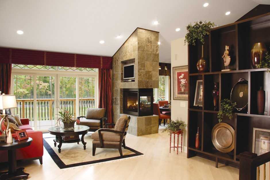 Если камин в интерьере городской квартиры планируется использовать действующий, то есть с открытым огнем или хотя бы просто излучающий тепло, то установить его надо в таком месте, чтобы между ним и сидящими рядом людьми не было «коридора». Наличие проходного пространства нарушит размеренность покоя отдыхающих. А поскольку вторжение в зону релакса всегда порождает раздражение, появляется риск возникновения скандалов, чего допускать не следует.