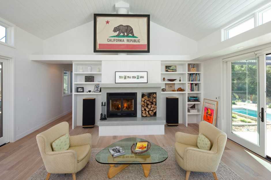 Обыграть скупость минималистического камина в интерьере, который кажется просто вырубленным в стене и лишенным всяческой отделки, можно, дополнив пространство идентичной по геометрии мебелью. Скупость же форм в целом компенсируется игрой светотеней и цвета.