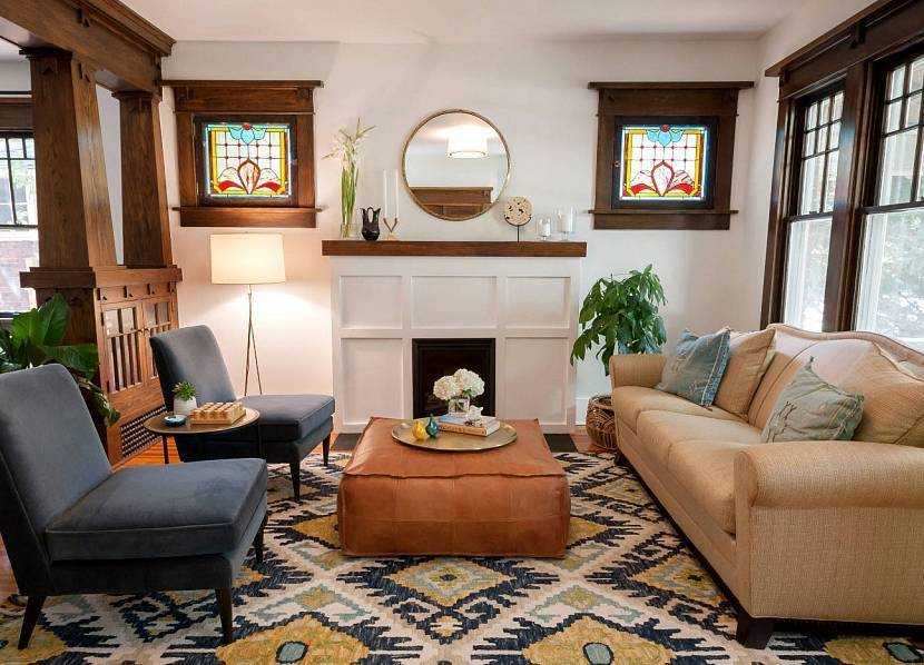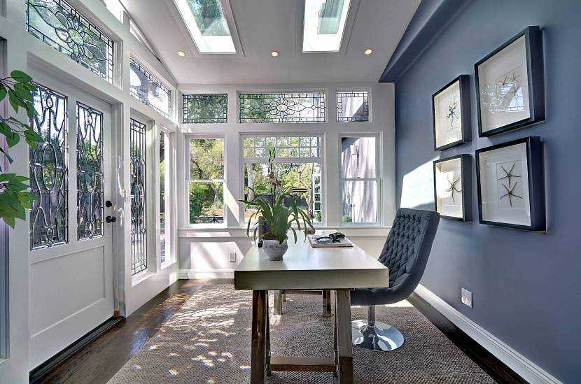 В гостиной комнате высокие окна лишь немного украшены витражами