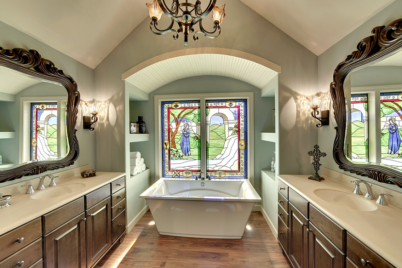 Ванная. Сюжеты витражных картин для ванной безграничны — от морского берега до цветущего японского сада. Используются матовые и зеркальные, с разной степенью прозрачности, устойчивые к влаге витражи.