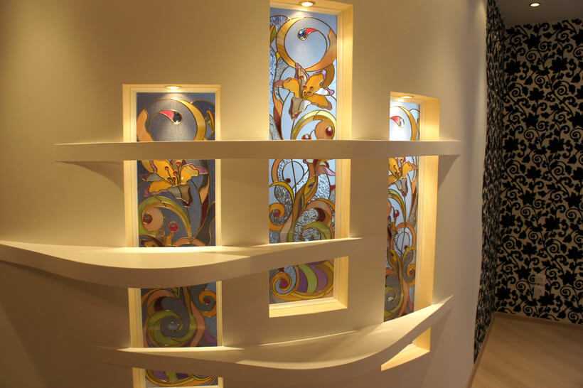 Формы повторяются, но использование непривычных материалов позволяет создать нечто неординарное. Помогут в этом и витражи. Внутренние стены ниш можно закрыть витражным экраном, за которым оборудована подсветка. Витражная ниша, сквозь которую льется свет, способна произвести впечатление.