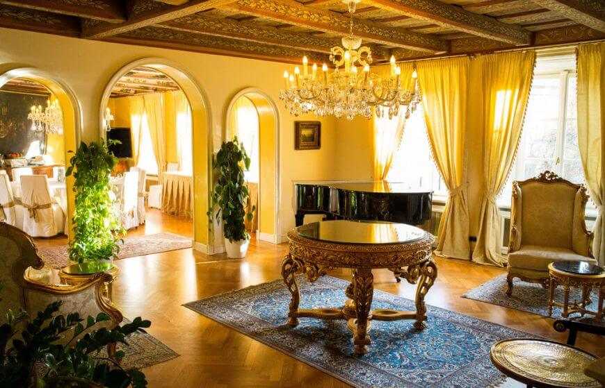 Обилие позолоченных декоративных элементов в гостиной подчеркнет высокий статус владельцев. Для отделки стен используйте декоративную штукатурку или тканевые обои.