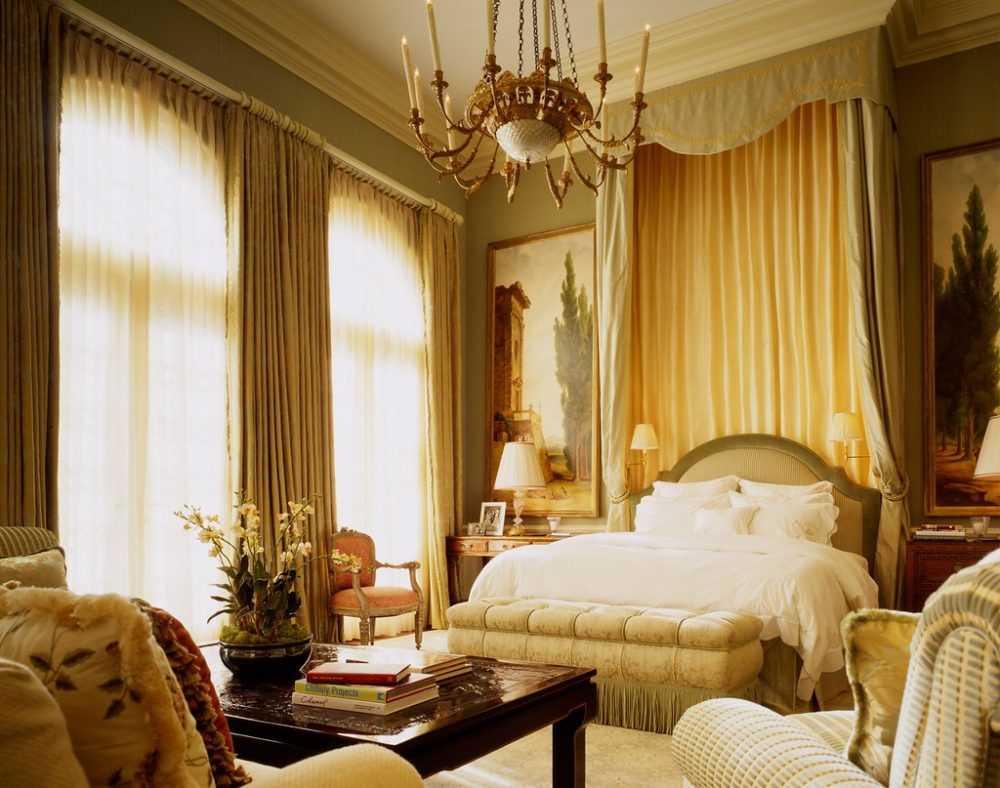 Прежде всего – шторы, настоящее украшение окон, сложные, богато декорированные, с декоративными шнурами, бахромой, кистями и подхватами. Раздвижные тяжелые шторы для спальни шьют из плотных, хорошо блокирующих свет, тканей, легкие – из прозрачного и тонкого тюля. Для покрывала кровати и декоративных оригинальных подушек подбирают узорчатые блестящие ткани – парча, бархат, атлас.