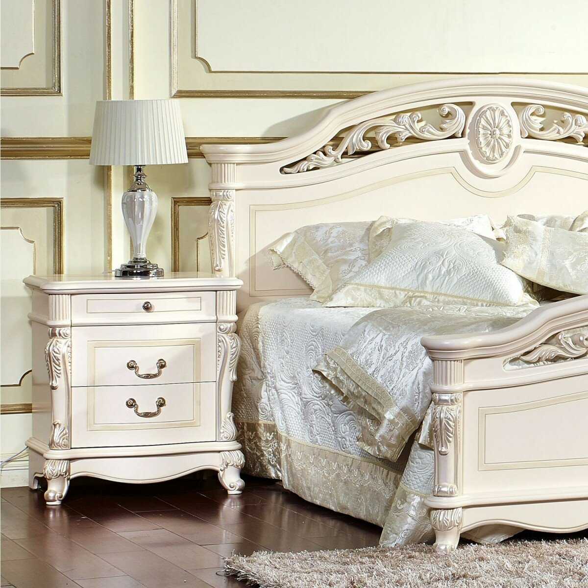 кровать – она должна привлекать внимание и создавать уют императорских дворцов. Весь декор должен работать на создание эффекта роскоши: массивное изголовье, балдахин, резные ножки