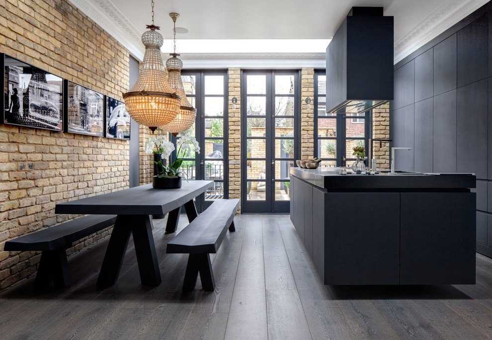 Этот прием, известный еще древним грекам и римлянам, широко используется в современной классике. Кухня, столовая и даже уютный уголок для послеобеденного релакса – в одной комнате. Легкие деревянные перегородки, многоуровневое освещение, эргономичные предметы интерьера — результат приятно радует.
