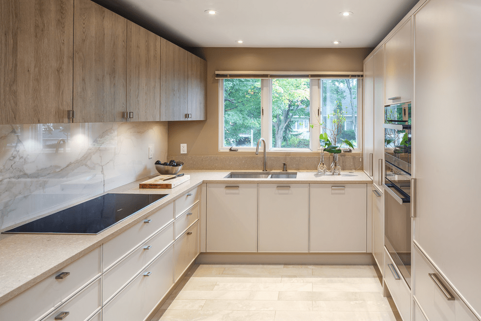 Красивое сочетание текстуры мрамора и дерева в дизайне кухни