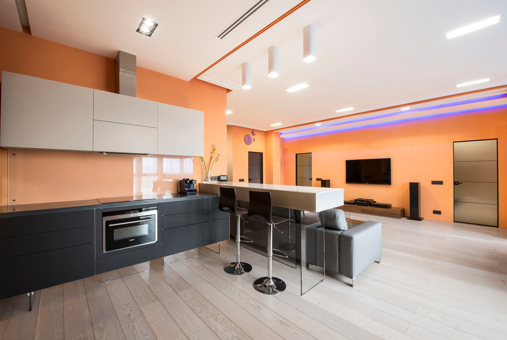 - Вариантов расположения модулей очень много, в результате чего получится создать практически любую конфигурацию — линейную, угловую, П-образную, островную, удачно обыгрывая форму помещения.