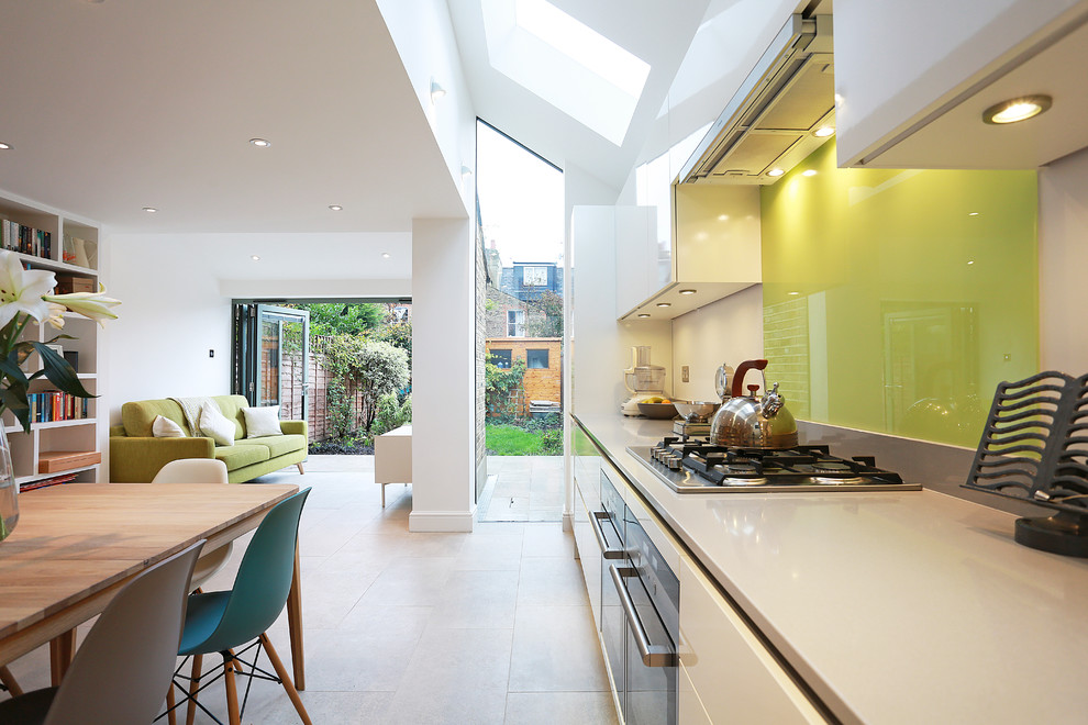 Основные элементы кухонного гарнитура проще всего располагать вдоль одной из глухих стен. В некоторых случаях удачно смотрится расположение мебели вразброс, когда модули расставляют, не стыкуя между собой. Такой вариант подходит для кухонь нестандартной формы или студийных планировок.