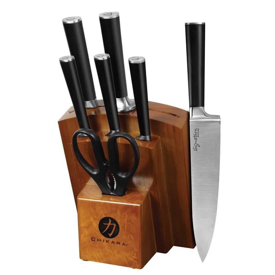 В набор входит: разделочный нож (20 сантиметров), поварской нож (20 сантиметров), нож сантоку (17,5 сантиметров), универсальный нож (14 сантиметров), нож для овощей (10 сантиметров), кухонные ножницы, деревянный блок для ножей.