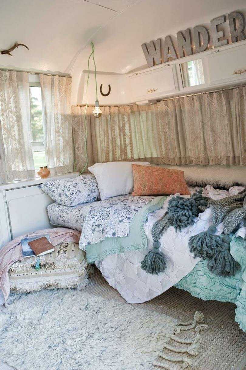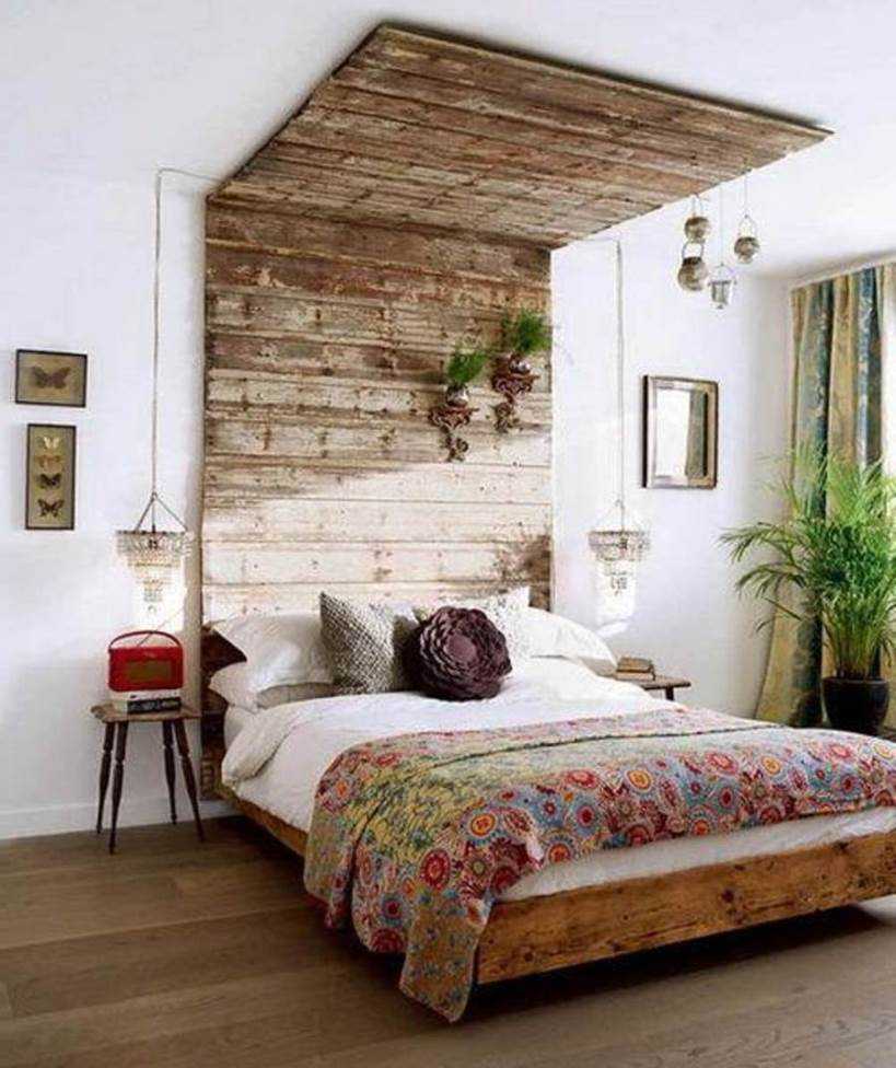 Уютный спальный уголок, оформленный в смеси стилей кантри и бохо