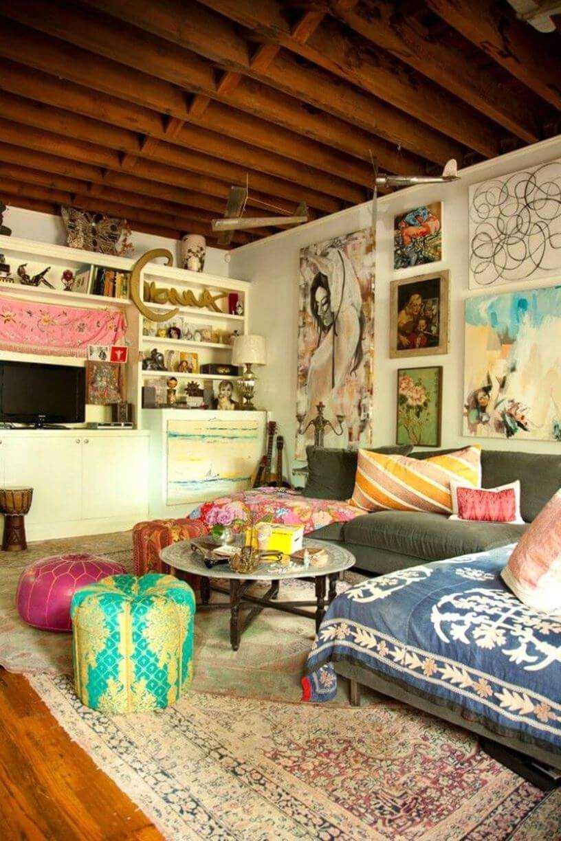 Отлично впишется в интерьер гостиной в стиле бохо старое бархатное кресло с накинутым на него пледом, потертый комод, доставшийся от бабушки, с коллекцией фигурок слонов на нем, кованый столик. Стены стоит украсить яркими картинами, фотография, масками, гобеленами. На пол положить тонкие ковры и соломенные дорожки.