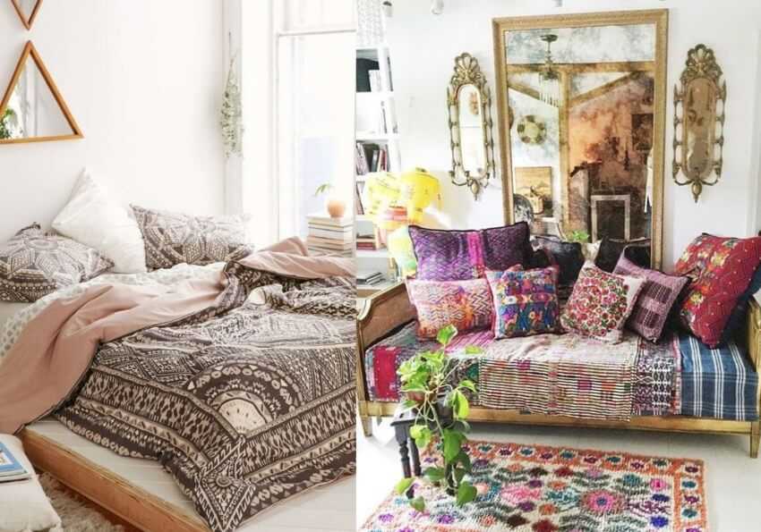 Стиль интерьера бохо в спальне с яркими накидками и состаренной мебельюИсточник happymodern.ru